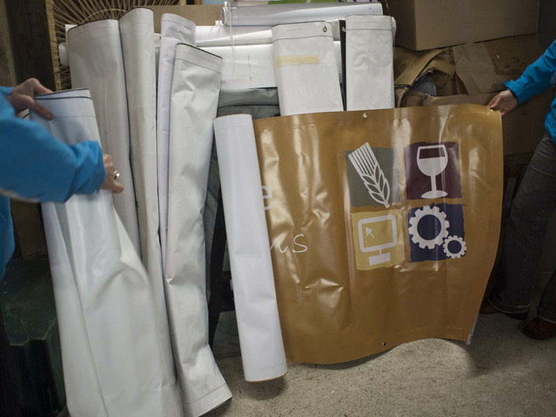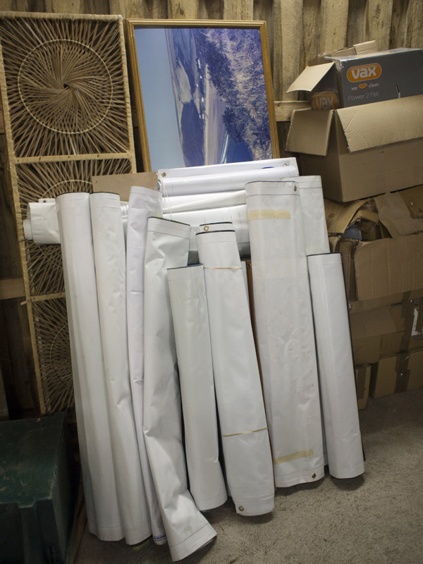 Here are 5 pictures of the banners and other art material donated to BBC from North Devon Plus. We have a whole load more banners to come in early 2012 from the Water Sports Festival. The plan is to run some workshops on banner making, using these as blank ‘canvases’. We also need to make some new promotional banners for BBC. Please start to think of creative ways of using this flexible plastic material and of what paint or other medium will be best suited to work on it.